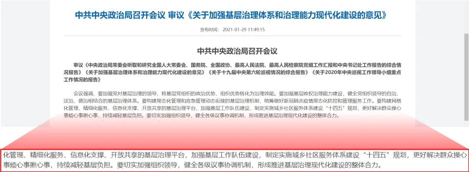 中央政治局1月28日召開會議,推進基層治理體系和治理能力現(xiàn)代化建設,中央總書記習近平主持會議。會議提到:要構建網(wǎng)格化管理、精細化服務、信息化支撐、開放共享的基層治理平臺,加強基層工作隊伍建設,制定實施城鄉(xiāng)社區(qū)服務體系建設“十四五”規(guī)劃,更好解決群眾操心事煩心事揪心事,持續(xù)減輕基層負擔。